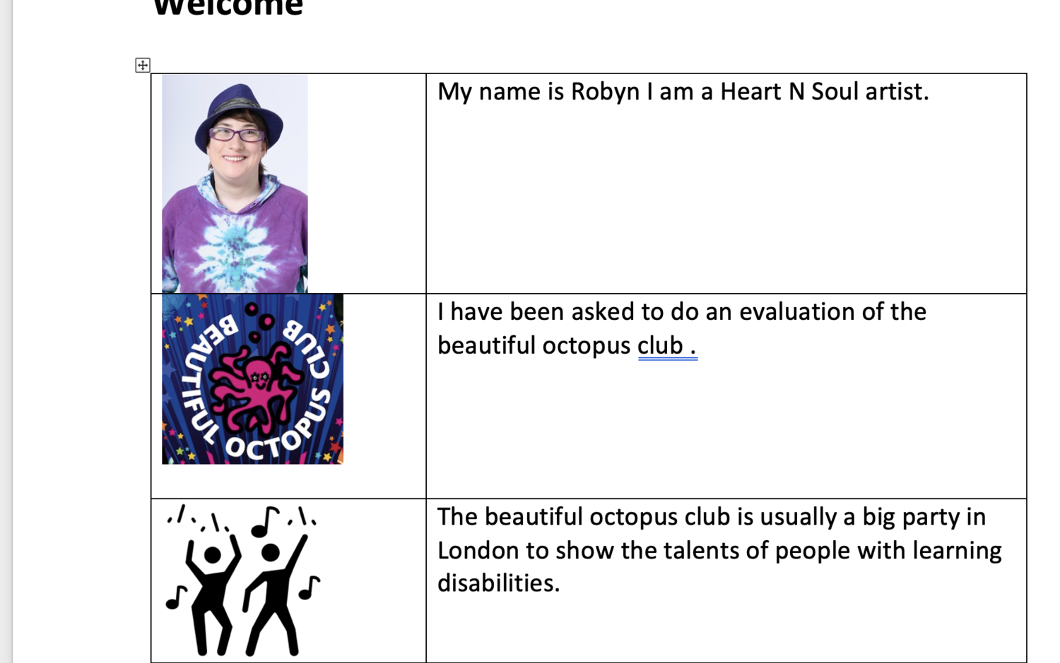 I did a evaluation of the Beautiful octopus club and write a report , easy read summary and made a short film about what I learnt.