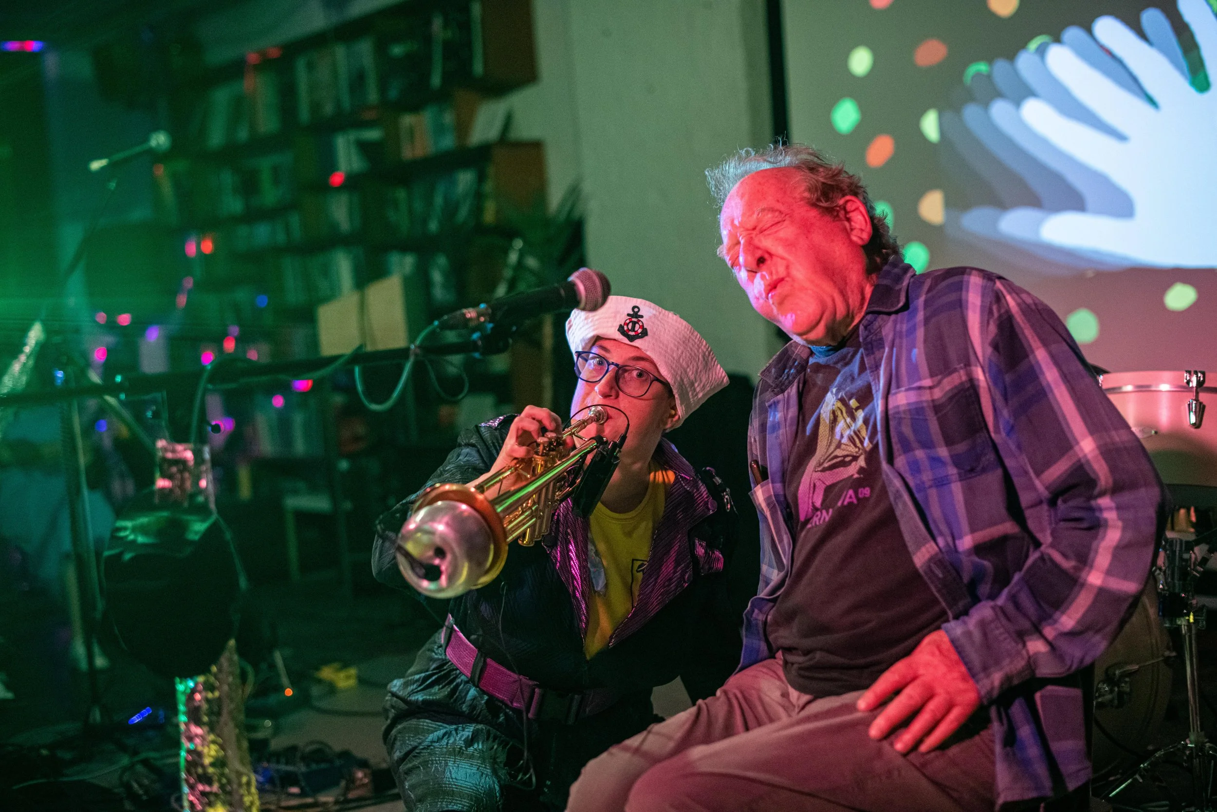performance with come and create a band for young autistic people based at Wigmore hall,.Jaime rucksack cinema provided projections, Betamax played drums, Ned Smith played bass , I played space trumpet , and come and create band played as well as the audiance , the come and create band also provided me with samples of things that give them joy. Photo by Jaime Rory Lucy