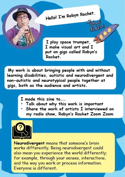 front cover of the zine with a cartoon sky with a rocket  there is a audio version available